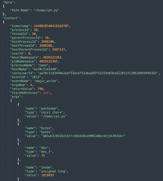 今回の攻撃で Tracee は、バイナリと Python ファイルのオンザフライでのドロップと実行という2つのドリフトイベントを検出しました。ターゲット環境にある既存のツールを使用する「住み分け」的なアプローチは一般的ですが、攻撃者はしばしば独自のツールを持ち込んで適用することを考えます。Tracee は、このような事象を検知するために設計されました。今回のケースでは、攻撃者は nano バイナリをダウンロードして cpt.py というファイルを作成し、このバイナリを cpt.py スクリプトと一緒に実行しました。