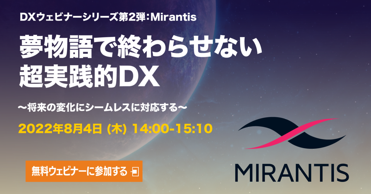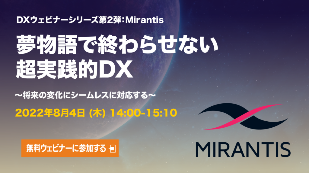 2022年8月4日に、DXウェビナーシリーズ第2弾:Mirantis編「夢物語で終わらせない超実践的DX」~将来の変化にシームレスに対応する~ を開催します。