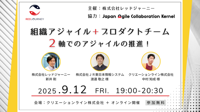 2025年9月12日に開催される株式会社レッドジャーニー主催「組織アジャイル + プロダクトチーム:2軸でのアジャイルの推進!」に弊社Scrum master / Agile コーチの中村(ikikko)が登壇します!このイベントはオンサイト(クリエーションラインAKB本社)とオンラインでの同時開催の予定です。 イベント概要(公式サイトより引用) アジャイル…