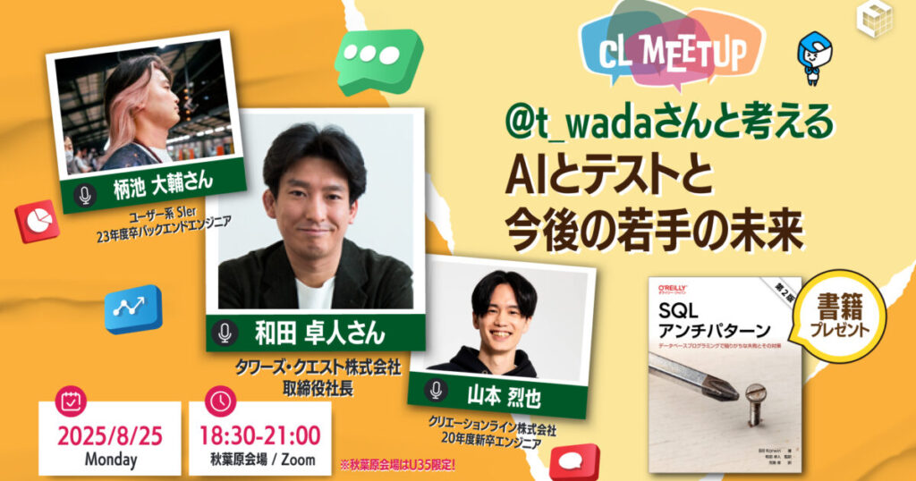 CL MeetUp Vol.38 本記事は 2025/8/25(月)18:30-21:00に、秋葉原会場+オンライン(Zoom)で開催するクリエーションライン主催のMeetupのご案内です。 20卒のクリエーションラインエンジニア発案! プロジェクトで自動テストの推進を行っていて、業務以外でもTDDや設計について積極的に学習している、れつさんが「TDDでのソ…