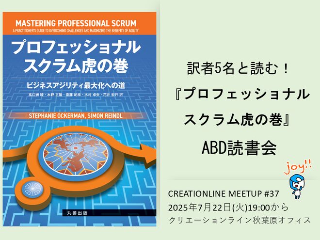 CLMeetup Vol.37 本記事は 2025/7/22(火)19:00-20:30に、クリエーションライン秋葉原本社(オンサイトのみ)で開催するABD読書会のご案内です。 刊行直前『プロフェッショナルスクラム虎の巻』ABD読書会を開催します!!! 訳者より本書籍のおすすめポイント 当日の意気込み・新しい本のみなさんの感想が聞けるのを楽しみにしています!…