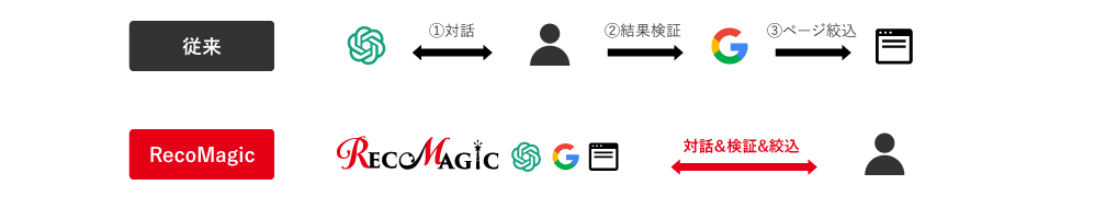 クリエーションラインが、独自に開発したレコメンドシステムRecoMagicを活用すれば、ChatGPTとの対話を簡単操作で実現でき、回答内容が確からしい結果のみ情報提供することが可能になります。