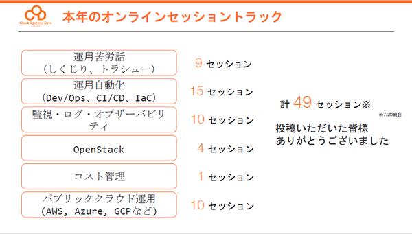 オンライントラックでは「運用苦労話(しくじり、トラブルシューティング)」「運用自動化」「監視・ログ・オブザーバビリティ」「OpenStack」「コスト管理」「パブリッククラウド運用」の6トラック、49セッションが配信される予定です。