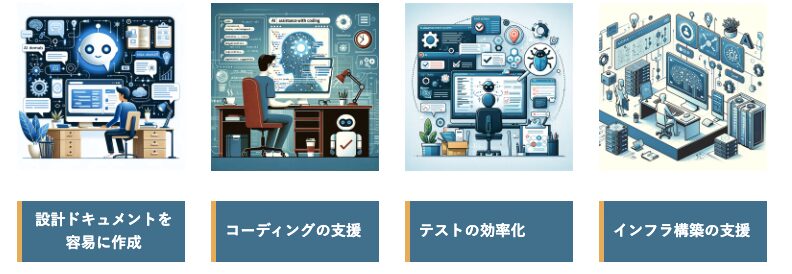開発プロジェクトでよくある問題、例えばコーディングスタイルのばらつき、不十分なテストによる品質のばらつきなどを解決します。生成AIを活用して、お客様の会社の知識やルールに基づいて仕様整理、UI/UXデザイン、設計、コーディング、テスト、インフラ管理を行い、お客様が高品質な製品をより早く提供できるように支援します。導入から効果の測定、人材育成からセキュリティ対策まで、幅広くサポートいたします。