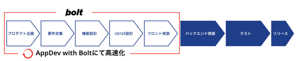 このような課題に対応するため、クリエーションラインでは新たなアプリケーション開発サービス「AppDev with Bolt」を提供します。「AppDev with Bolt」では最新のAI駆動開発ツールである「Bolt.new」を核とし、アプリケーション開発プロセス全体を刷新し、開発効率の飛躍的な向上を実現しています。