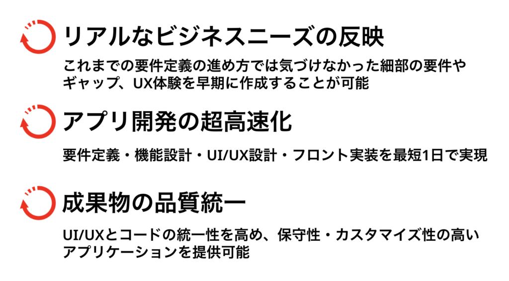 Bolt.newを活用することで、ビジネスユーザーと開発者が同時にリアルタイムでアプリケーション開発を進められます。これにより、要件定義フェーズを加速させるだけでなく、従来の方法では見落としがちだった細かな要件やギャップを早期に発見し、要件定義に反映することができます。