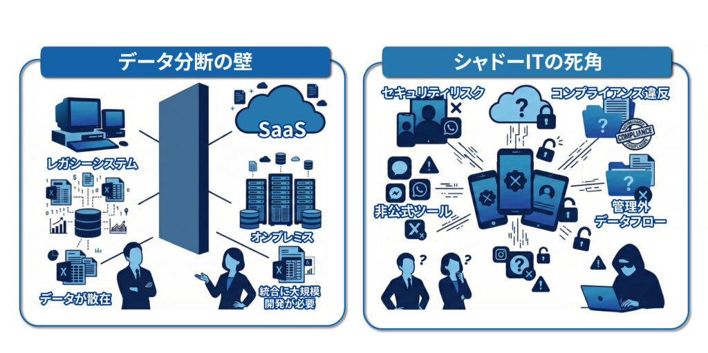 - 運用の壁(シャドーITとセキュリティ): 現場が独自のローコードツールなどでデータ連携を行った結果、誰がどの重要データにアクセスしているか把握できない「野良ツール」が乱立。情報漏洩リスクや、不適切な権限によるデータ事故の温床となっています。