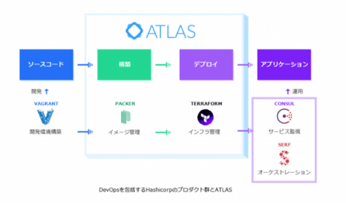 現時点で対象となるHashiCorpプロダクトは、Vagrant、Packer、Terraform、Serf 、Consulの5つのプロダクト群と、これらを連携し、開発から運用まで一貫したワークフローを提供するATLASです(下図参照)。