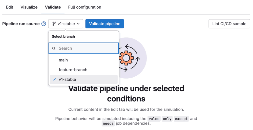 これまでは、パイプラインエディタの「検証」タブで変更を検証する際、シミュレーションはデフォルトブランチに対してのみ実行可能でした。本リリースでこの機能が拡張され、任意のブランチを選択してパイプラインをシミュレートできるようになりました。