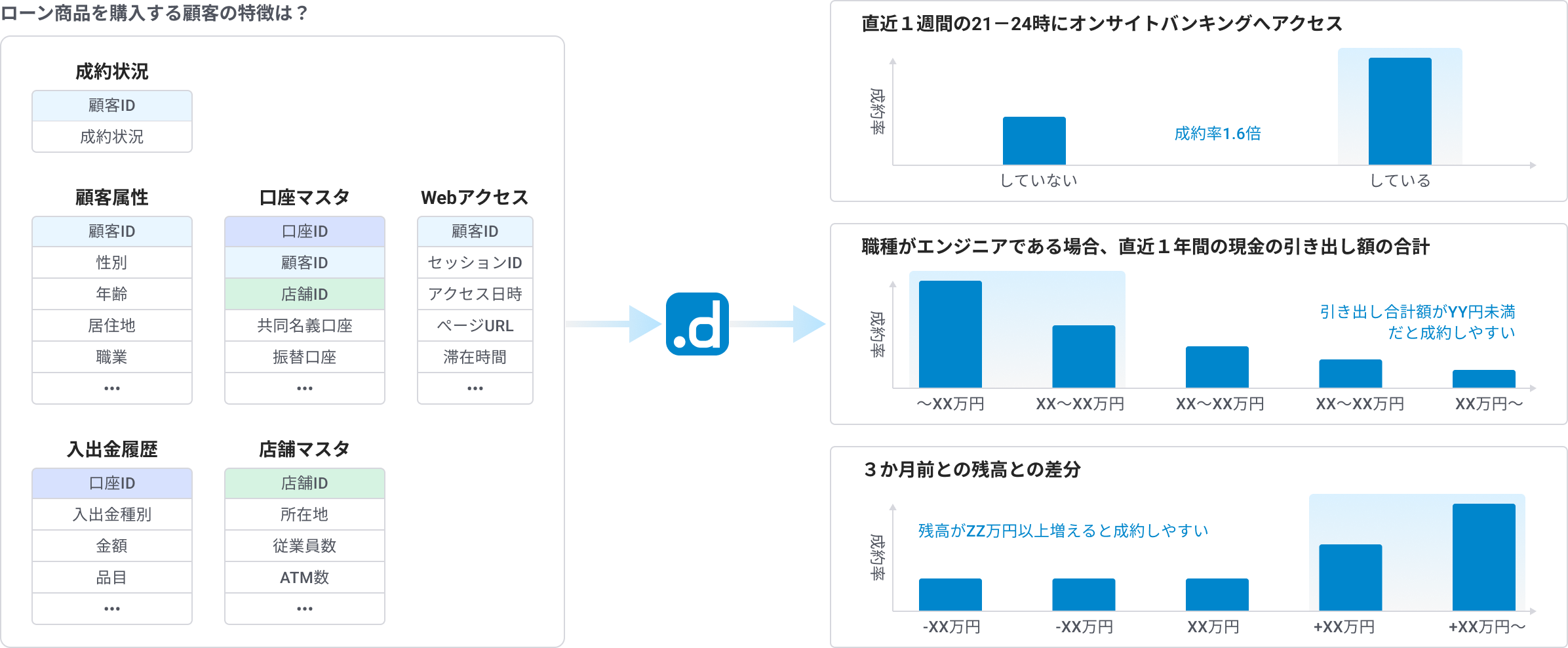 企業のデータ分析・活用において、最も重要かつ難易度が高い「特徴量自動設計」技術を用いて、複数のデータソースから自動的に特徴量を抽出し、高度な予測分析やビジネスインサイトを導き出します。dotDataのAIが導き出す特徴量は、網羅性と解釈性、独自性が高く、手作業では不可能な広範囲の特徴量仮説や、判断のポイントとなる閾値まで抽出できます。