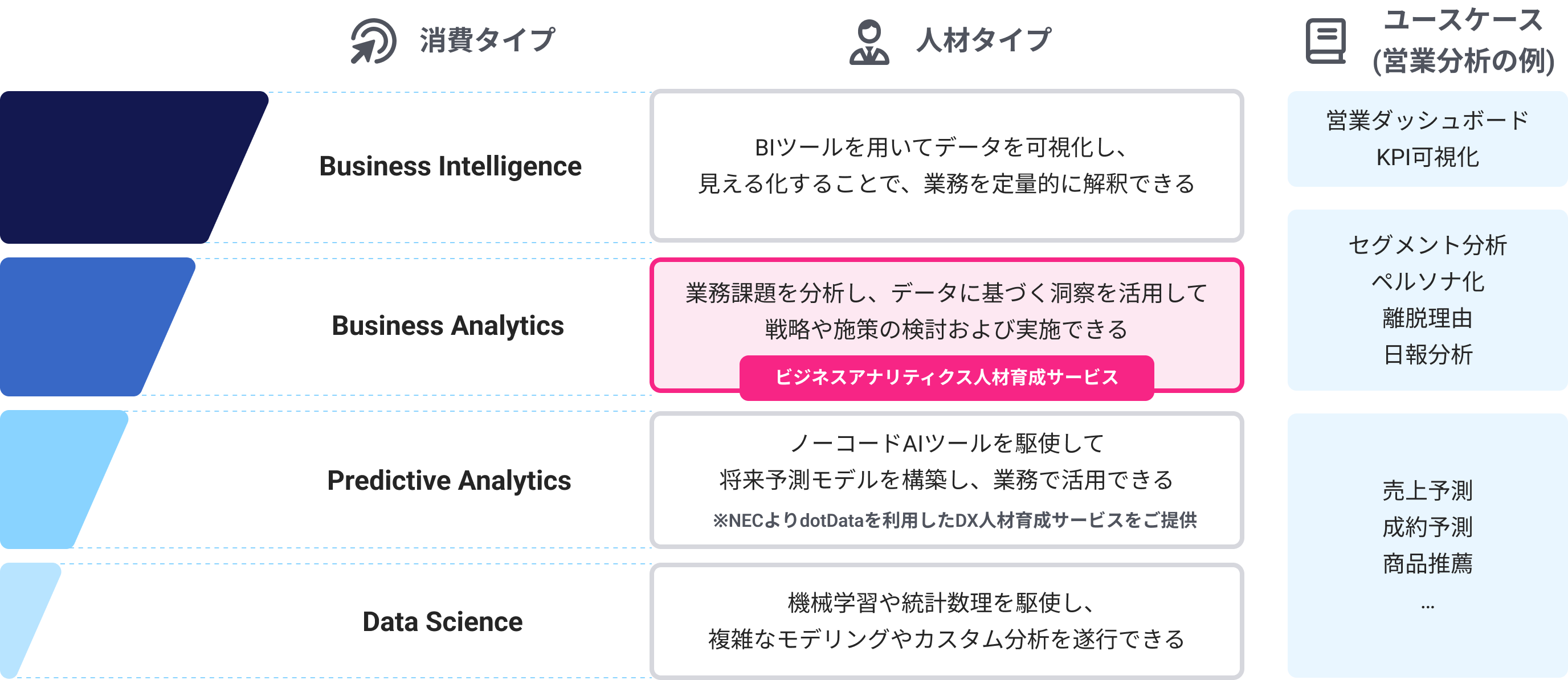 otData ビジネスアナリティクス人材育成サービスは、業務部門がデータ活用の主役となり、業務課題を分析し、データに基づく洞察を活用して戦略や施策を検討及び実施できる能力を育成します。また、分析実施者だけでなく、分析結果を理解するための人材リテラシーの向上と、業務部門と分析部門間の橋渡し役の育成を通じ、実践的なデータ活用を実現します。