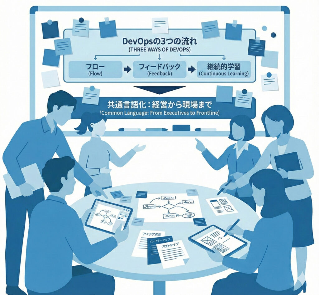 本書の中核となるのは、DevOpsの3つの流れ(フロー、フィードバック、継続的学習)という考え方。 単なる技術論ではなく「なぜ現場は回らなくなるのか」「どうすれば組織として改善できるのか」を、経営層から現場メンバーまで共通言語で理解できる点が大きな特長です。