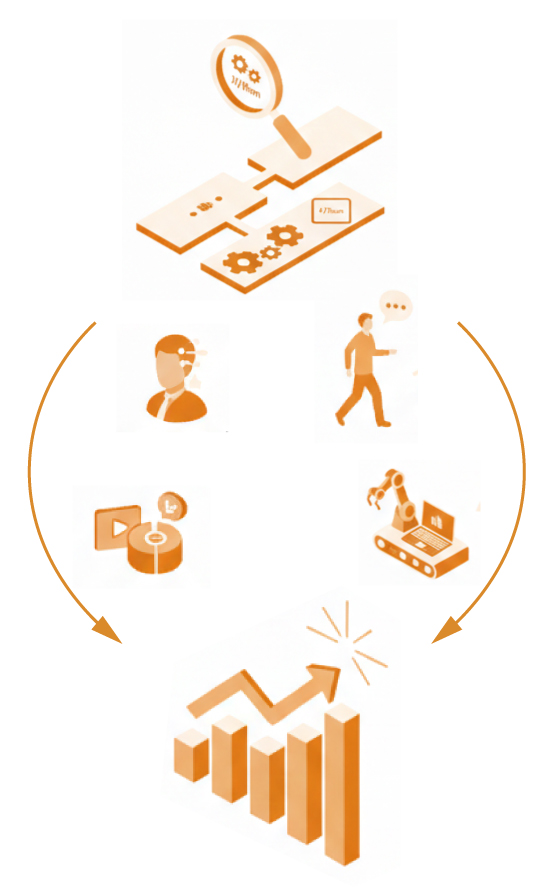 反復作業・判断ルールが明確な工程など、AI/自動化に適した領域を見つけます。