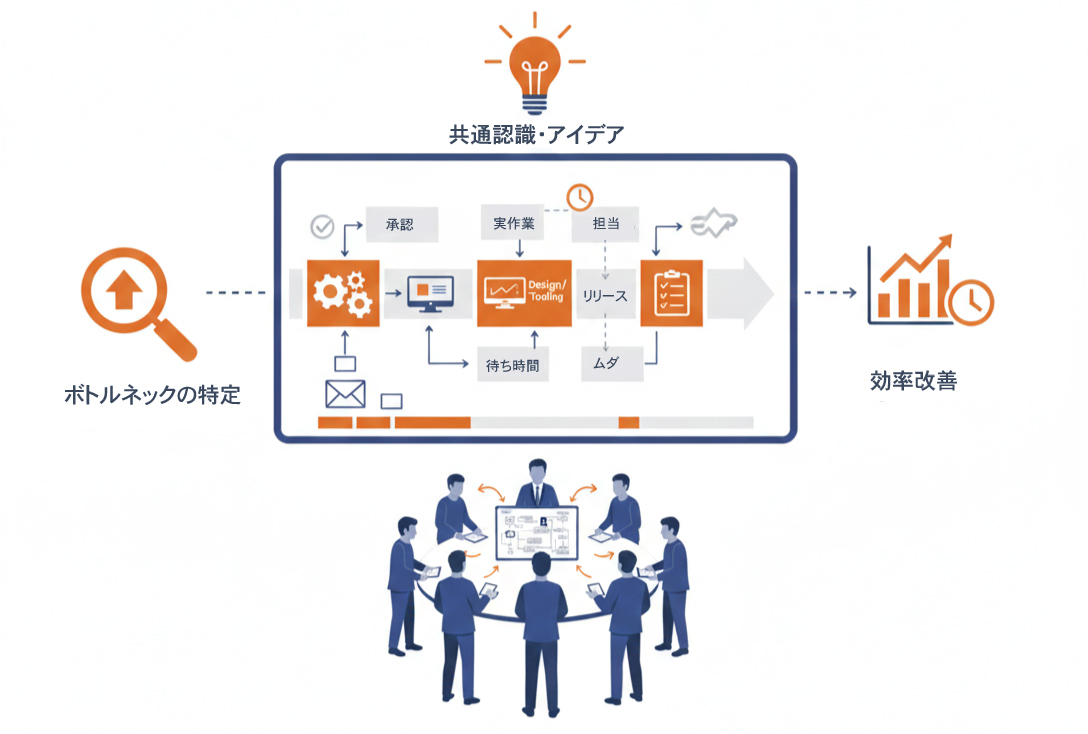 部門や役割を超えて関係者が集まり、同じプロセスを同じ視点で捉えることで、組織の壁を越えた合意形成を促進します。