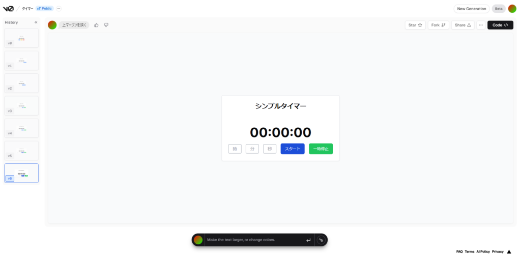 指示出しからUIの生成までは数秒で完了します。一度出力されたUIに対して、追加の指示を出して改訂が可能です。画面上でUI要素をクリックして、それを変更させるというような指示も可能です。こちらの指示をかなりよく理解して生成してくれます。