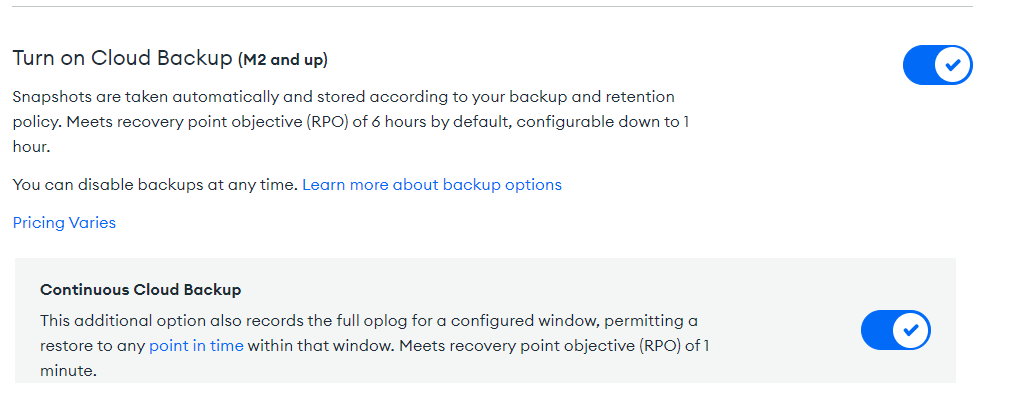 Atlasでは標準でバックアップの機能が備わっています。通常のCloud Backupと、追加オプションでContinuous Cloud Backupが使用できます。
