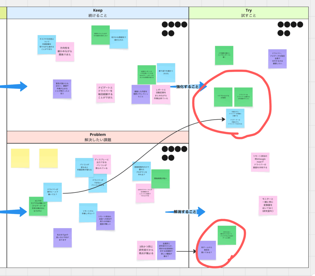 こちらはチームの働き方そのものを見直す場で、開発サイクルでの経験を振り返り、次に生かすために「何を変えるか」を決めます。