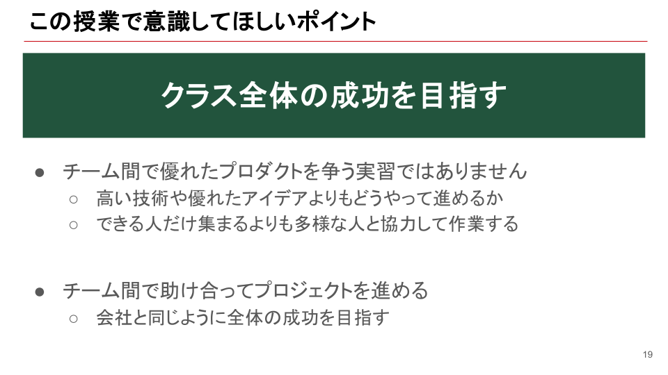 詳細は次章でも触れますが、この講義では、クラス全体や別チームへの貢献につながる行動が、より高い評価にもつながるようにしています。