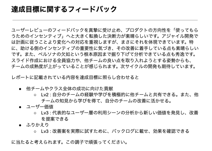 「受けたフェードバックから、必要とされている機能やアプリの現在の課題について考えることができた。また、アプリの方向性についてチーム内での解像度を高めて共有し、実装機能の計画を立て直すことができた。」