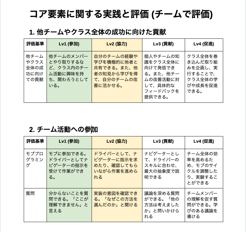 代わりに、チーム開発に必要なふるまいを段階的に整理したルーブリック(達成目標)を用意し、学生がどこまで到達できているかを見ています。