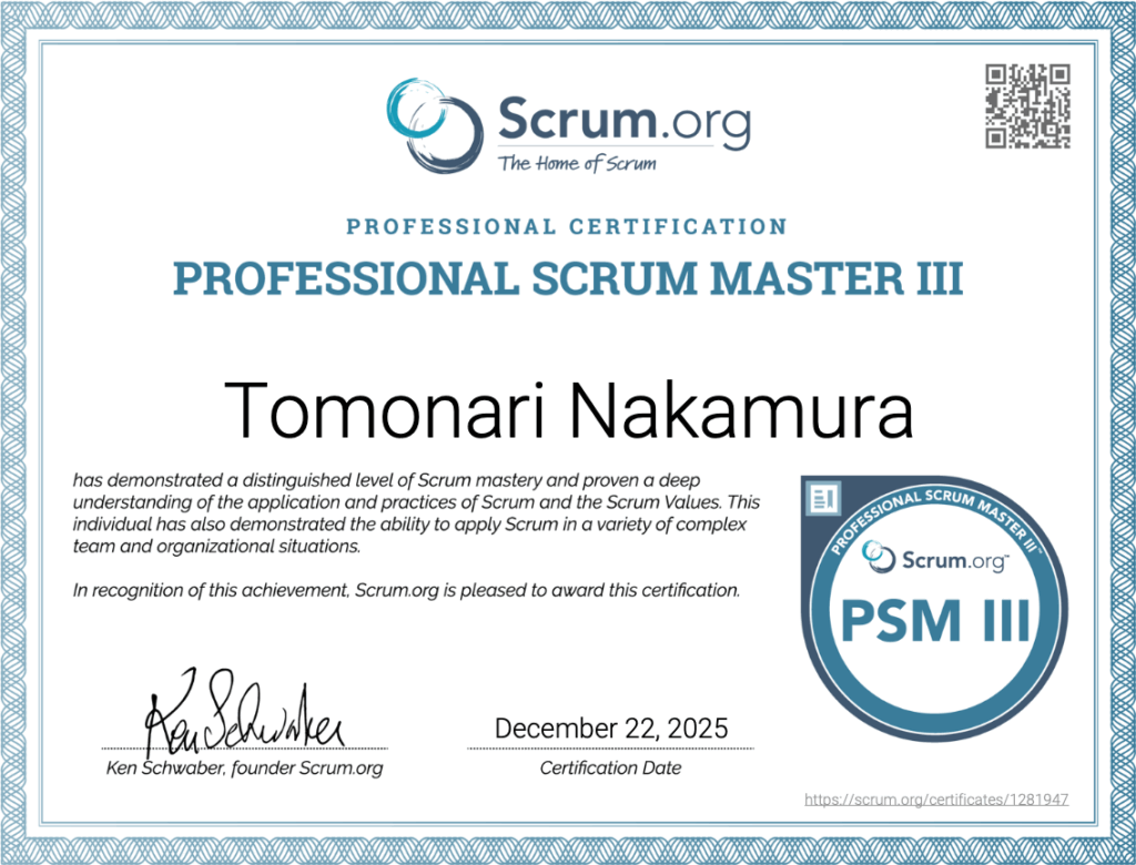 というわけで、(2025年12月22日時点でおそらく)日本人第一号となるPSM IIIを取得しました!認定試験を受けて終わりではなく、ここからの展開も色々考えてるので、2026年もよろしくお願いします!!