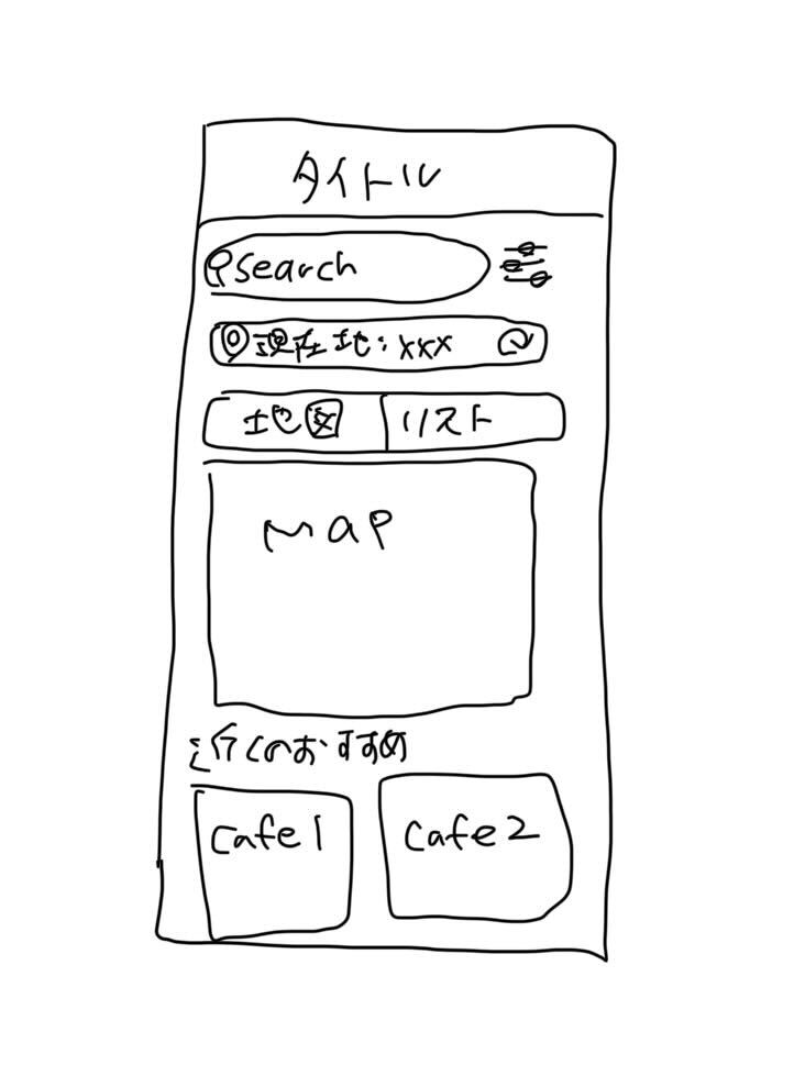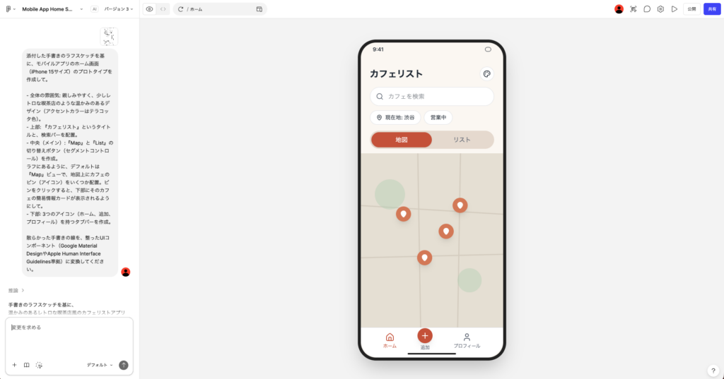 カフェのリストを管理するアプリの雑な図から、地図やリスト表示を切り替えられるしっかりとしたUIが生成されました。