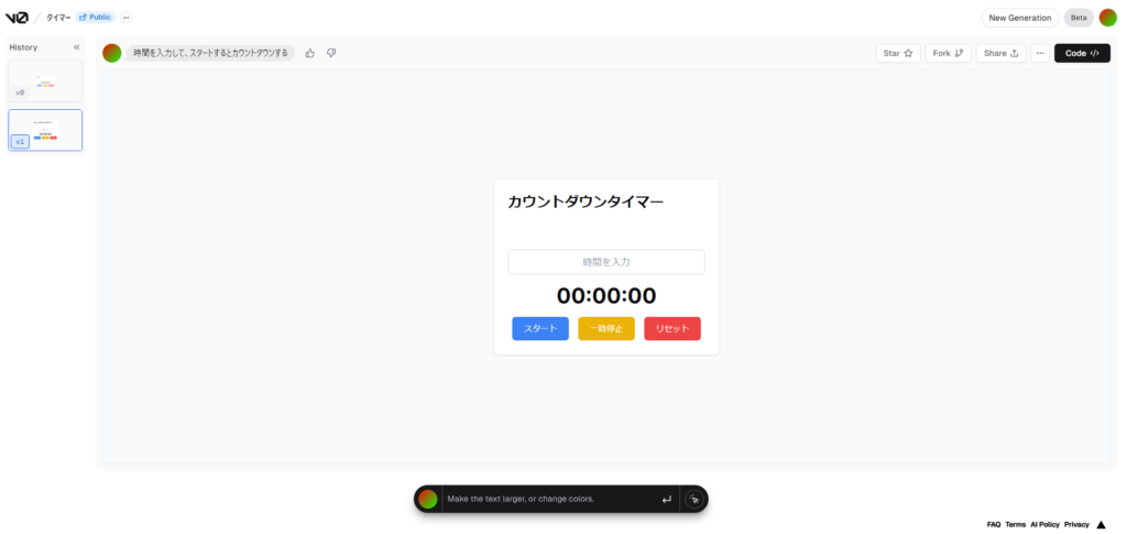 シンプルなタイマーアプリを作成します。v0でUIデザインを行い、それをReactコードとして出力してから、VSCodeを使って簡単な機能実装までを実施します。その後で、デザインの変更にもチャレンジします。