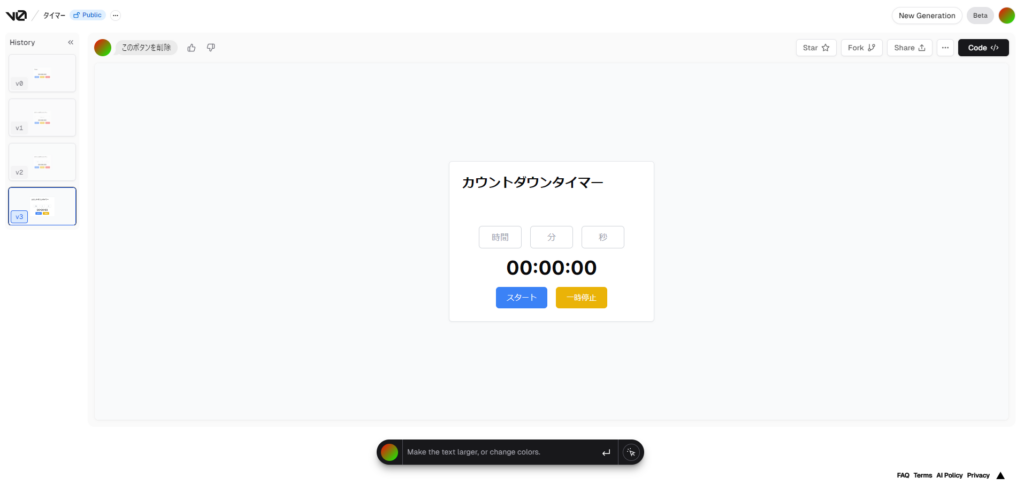 まずはアイデア出しからです。細かいことは指示せず、単純に「タイマー」とだけ入力してUIを生成させてみます。