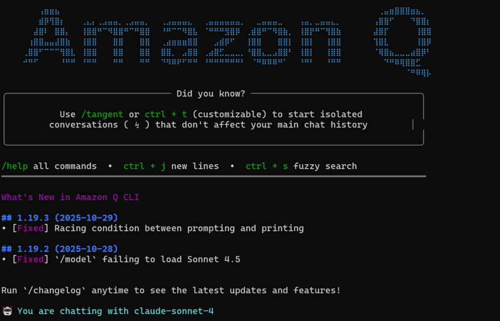 では、Amazon Qでチャットを起動してみましょう。コマンドラインで「q chat」と入力すると、次のような画面が表示されます。