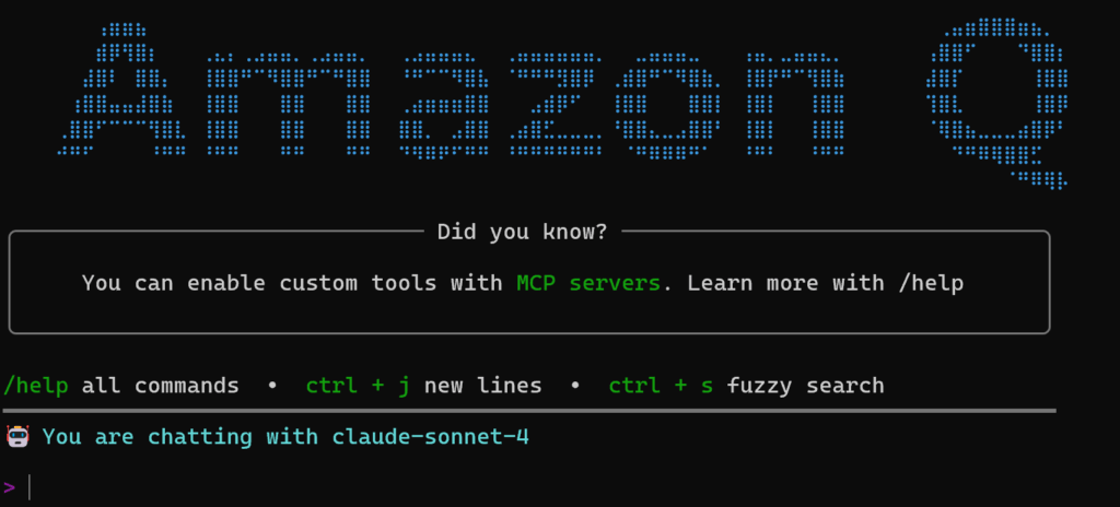 ここでは、AIアシスタントとしてQ CLI(AWS Q Developer)を使っています。AWS MCP Server自体は、Q CLI以外のAIアシスタントを使っても構いません。