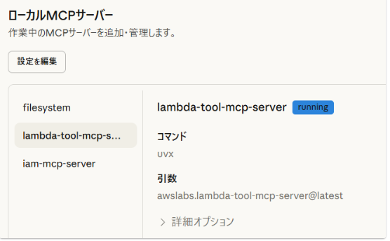 Lambda MCP Serverの設定が正しく反映された場合は、Claudeの「ローカルMCPサーバー」に一覧が追加され、running状態になっているはずです。