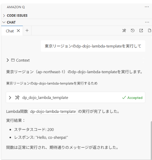 以下のようにQ CLIでLambda MCP Serverを実行してみました。