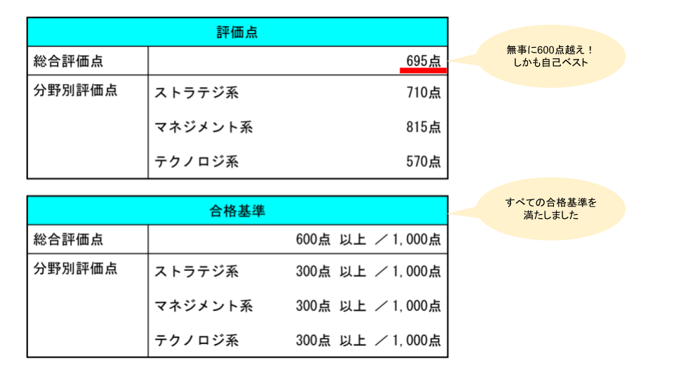 結果は過去自己ベストの得点でした。最も苦手にしていたテクノロジ系も無事300点を超え、次に苦手だったマネジメント分野で8割以上取れたのはうれしかったです。