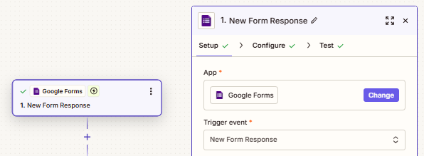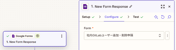Googleフォームへの送信を直接検知することができないため、Googleフォーム側で回答をGoogleスプレッドシートに出力するように設定しておき、スプレッドシートへの行の追加を検知するトリガーにします。