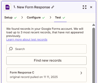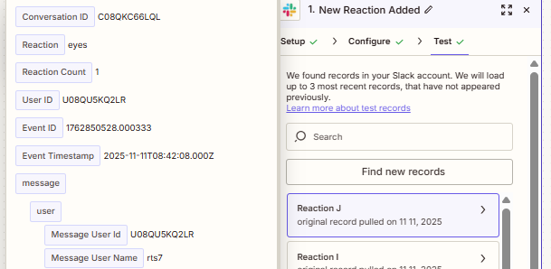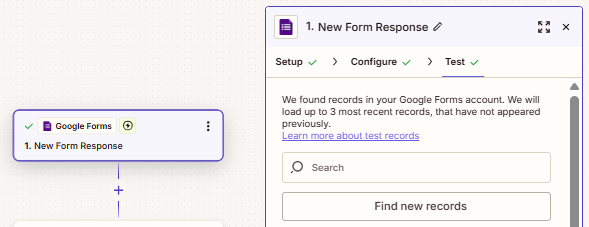 その後、Zapier画面に戻り Test ステップで Find new records をクリックします。