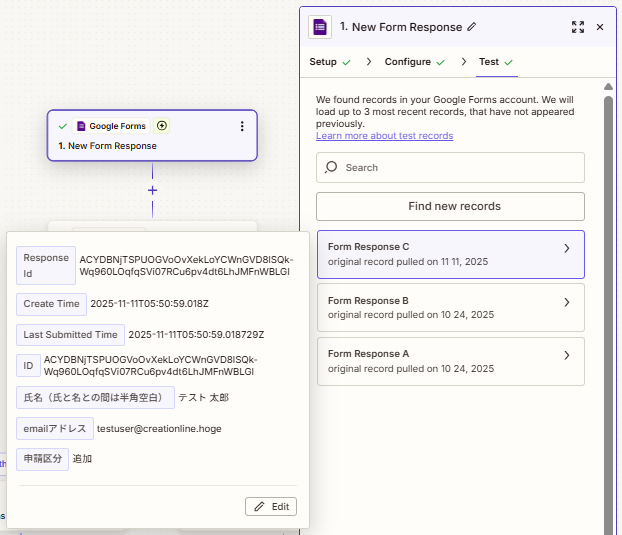 この後作成していくアクション内で、フォームにどういう記入欄があるかの情報が必要となるため、このように一度サンプルデータを送信して、Zapierに認識させておく必要があります。