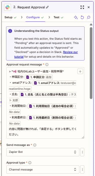 これも先ほどのワークフロー同様、次のステップ以降で作成していくアクション内で必要となるため、サンプルデータを送信して、Zapierに認識させておきます。