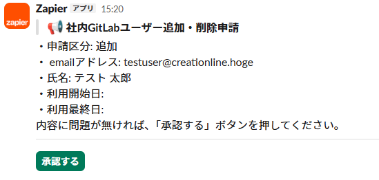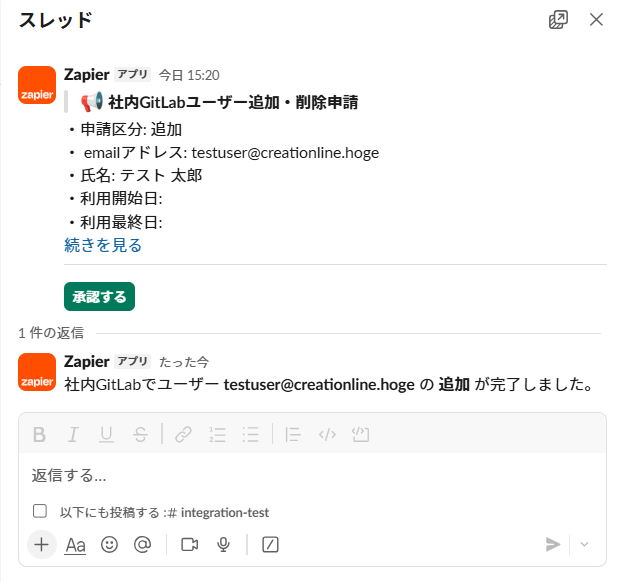 あとは仕上げとして、ユーザーの追加・削除が完了したことをSlackに通知します。