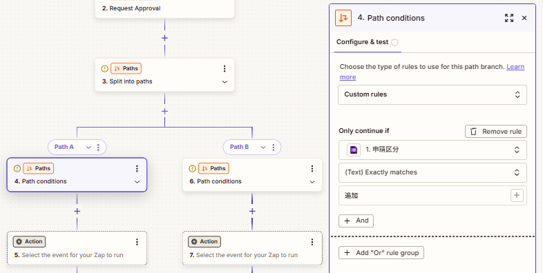 今回は申請区分にユーザー追加と削除があり、それによって後続のアクションが変わってくるため、「Paths」という機能でフローを分岐させていきます。