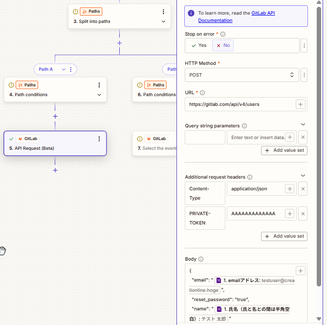 あとは分岐先でそれぞれGitLabユーザーの追加、または削除のアクションを設定していきます。