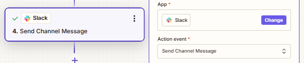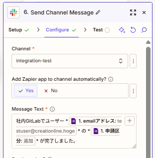 なお、Zapierは分岐後の合流ができない仕様なので、ちょっと面倒ですが分岐後の両方にこの完了通知のアクションを追加する必要があります。(完了通知するだけのサブワークフローを作り、それを呼び出すという手もあります)