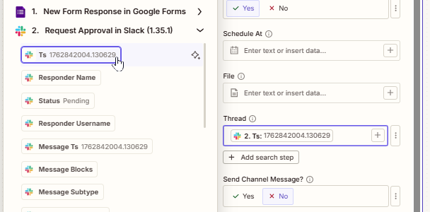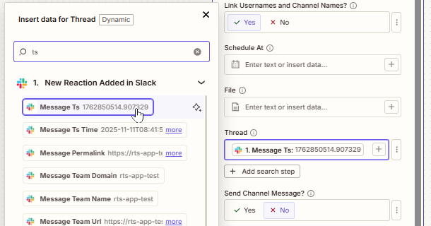 - Thread: ここに投稿元のTs(Slackの投稿を一意に表す値)を指定することで、投稿元のスレッド返信にすることができます。(※右側の[...]ボタンをクリックしてCustomを選択すると、投稿元のTsを選択できるようになります)
