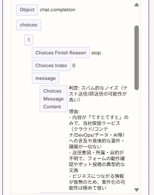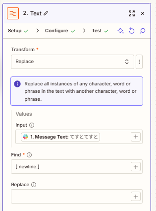 当社環境では筆者にこれらのAPI Keyを直接利用する権限が無いため、APIリクエストを送る形で生成AI連携をしています(次のアクションで出てきます)。その関係で入力文の改行をここで削除する処理をしています。