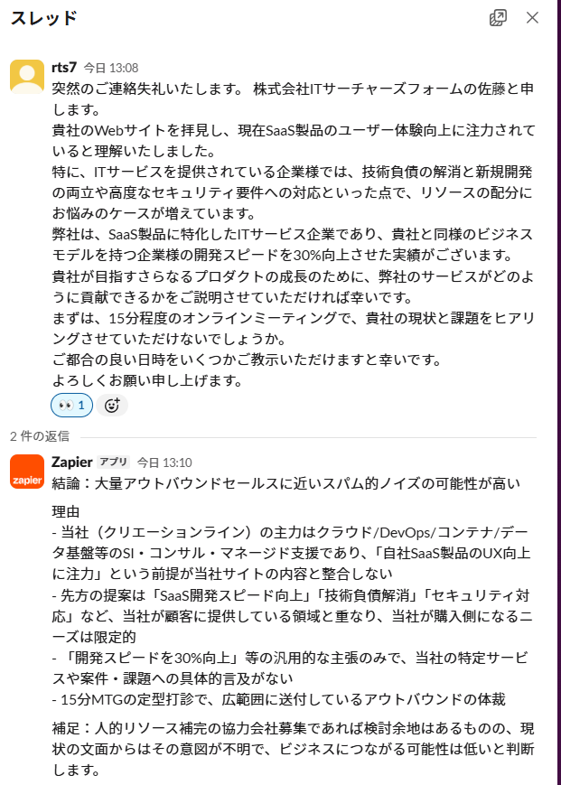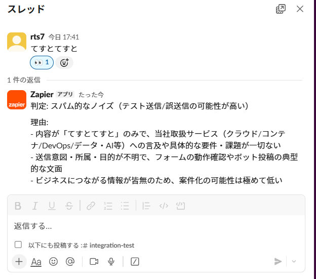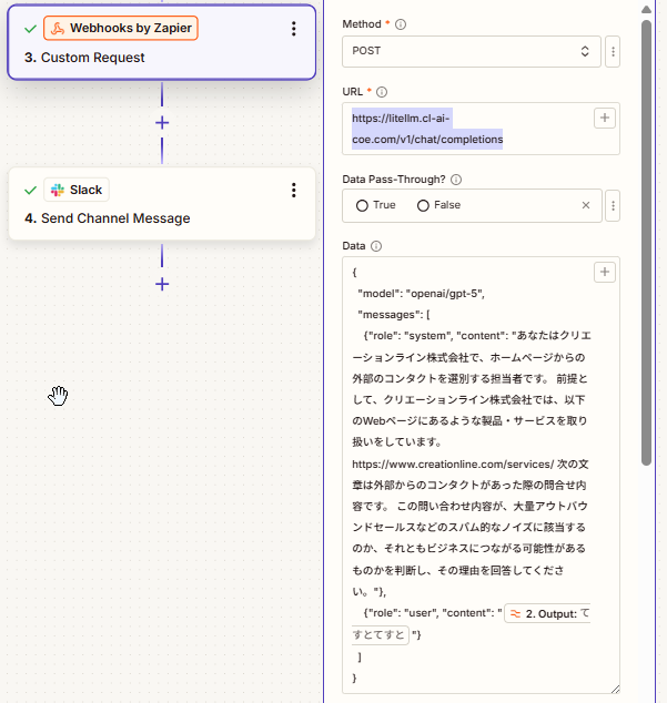 例2: Slackの投稿内容を生成AIに渡して、プロンプトで処理した回答をもらう