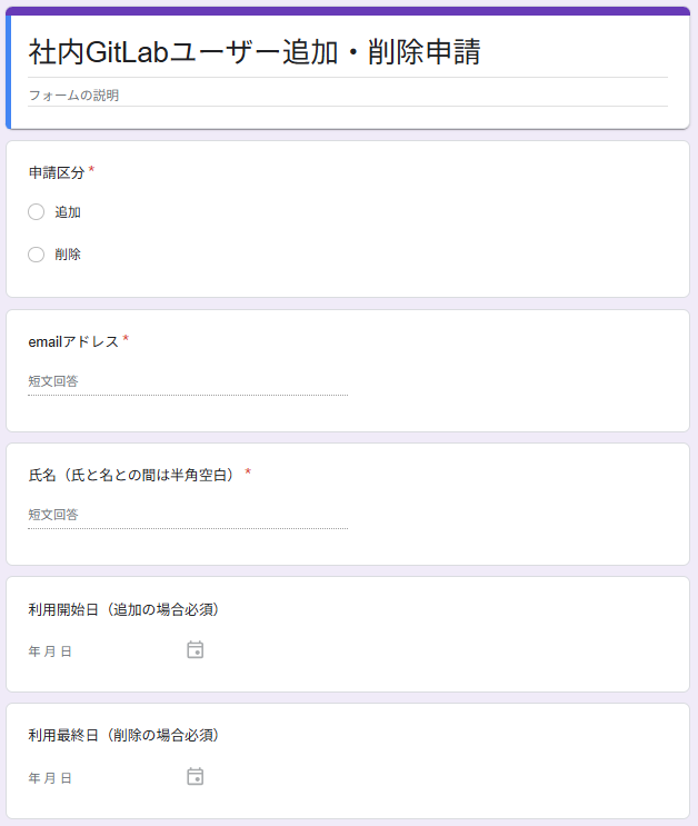 今回はサンプルとして、社内GitLabユーザーの追加・削除申請というシナリオに沿って作成していきます。