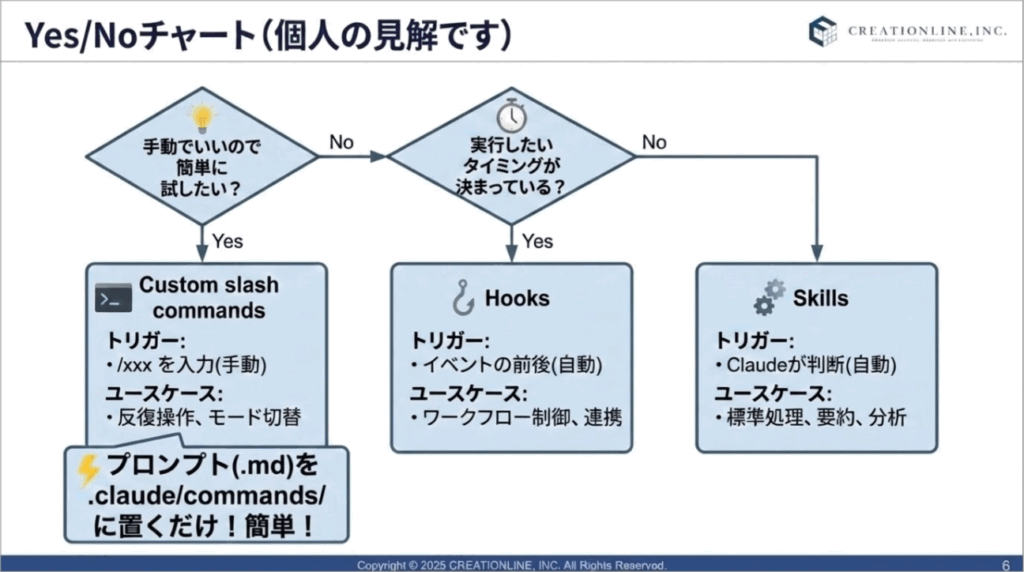 - スラッシュコマンドの実態はプロンプトなので、AIでやりたいことなのかを判断する必要があります(スクリプトでよければスクリプトで)