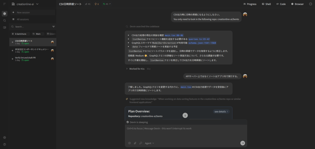 Devinは計画に従って調査・改修・テストなどを進めていきます。状況はリアルタイムでチャットUIに表示され、人間はいつでも追加の指示を出すことができます。途中で打ち切りにして、人間が続きを実装することもできます。AIにありがちな「最後の細かい部分がうまくいかない」が発生した場合は人間が引き継ぎましょう。