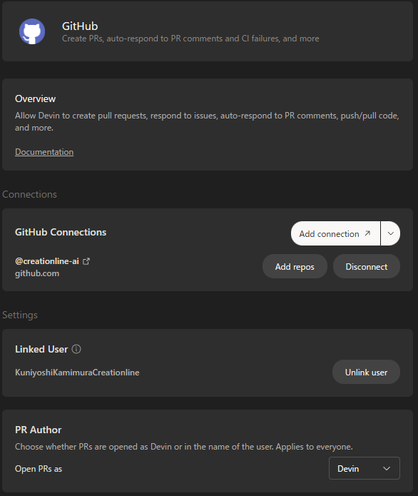 セッションを行いたいGitリポジトリをDevinに接続します。GitHubやGitLabに対応しており、OAuth経由で簡単に接続できます。