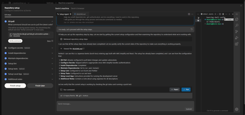 されます。それに続けて、依存パッケージや必要なツール(例:Yarnの最新版)のインストール・設定を行います。また、そのリポジトリ(プロジェクト)の起動コマンド、LinterやUTの実行コマンドなどを設定(=Devinに教える)します。設定はDevinがリポジトリの中を検索して自主的に進めてくれるので、人間は必要に応じてサポートしたり承認したりするだけです。人間のチームメンバーが開発環境を構築する際と同様で、README.md