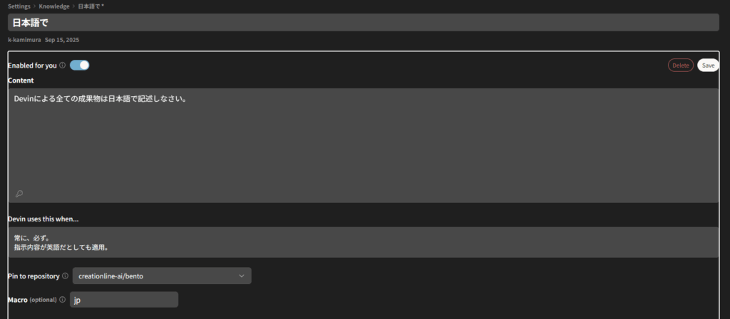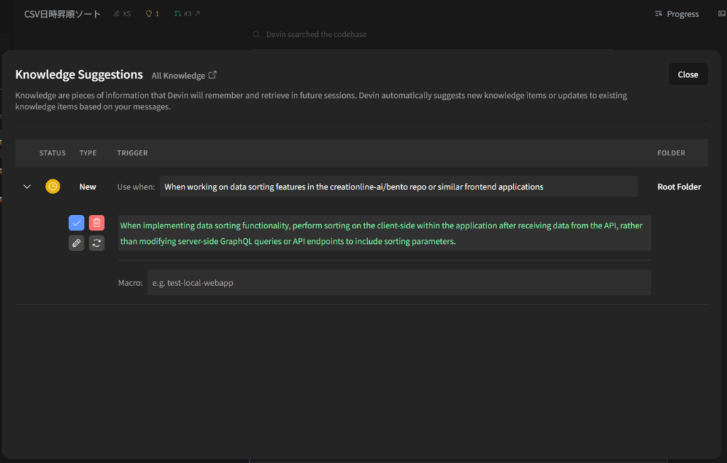 Knowledgeは、Devinに「社内の常識」「プロジェクトの常識」を教える仕組みです。例えばパスワードポリシー、エラーハンドリングの規約、ブランチの命名規則などです。作成したKnowledgeは以下のように使うことができます。